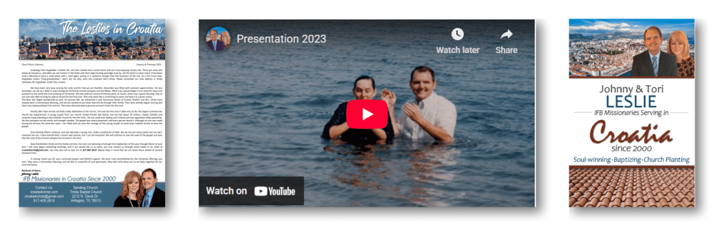 This page is designed to help you stay connected with what God is doing in our ministry and how you can be a part of it. Here you will find our presentation video, prayer letter, and prayer card, each offering a different way to understand the burden the Lord has given us for Croatia. We encourage you to take a few moments to watch, read, and download these resources, and to seek the Lord about how He would have you be involved. Whether through prayer, encouragement, or support, your partnership helps make the finished work of Jesus Christ known, and we are truly grateful for your investment in this ministry.